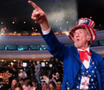 A man points toward the stage before former President Donald Trump's appearance at the "Rally to Protect Our Elections" co ...