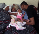 {Teka Adams cuddles with her baby Miracle and husband PJ at their first new apartment after living in a homeless shelter and then at her mother's home. (Photo by Carol Gu ...