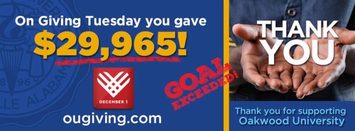 On December 1, Oakwood University supporters demonstrated the spirit of giving and generosity by participating in Giving Tuesday, a worldwide celebration fueled by social media and collaboration. Yesterday, alumni, students, employees and supporters around the world overwhelmingly helped Oakwood exceed its $25,000 goal for the day. Kisha Norris, M.Ed., CFRE, executive director of advancement and development, happily reported that Giving Tuesday 2015 brought in a total of $29,965.