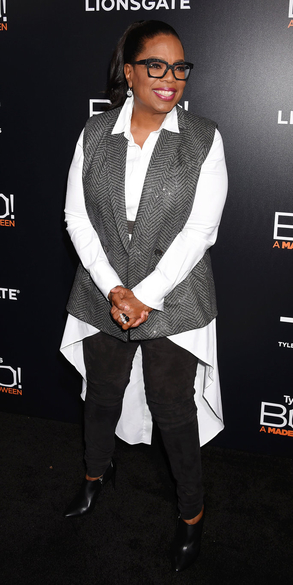 That’s what happened on Monday in Los Angeles, where the 62-year-old talk show host and multi-media mogul headed to Tinseltown’s ArcLight Cinerama Dome for the premiere of Boo! A Madea Halloween. For her unexpected outing, the household name looked put together in black, white, and gray separates. Oprah turned to tailored pieces like black trousers, a billowing white shirt with a cape-like detail, and a wrap-around vest.